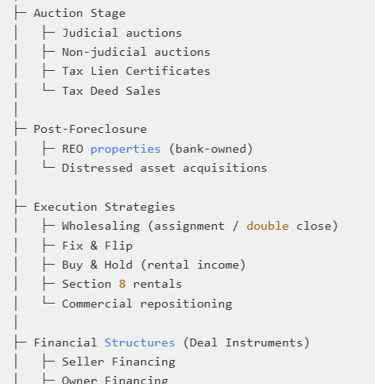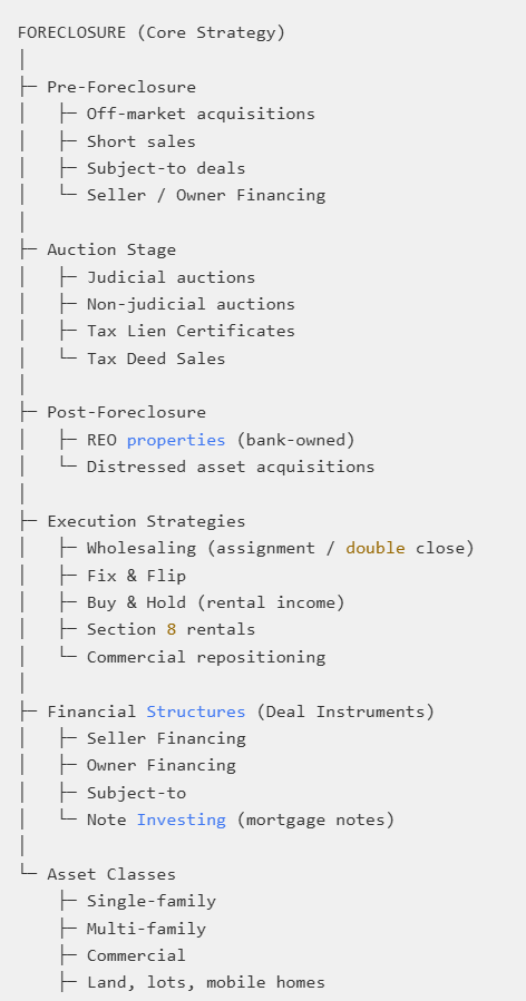 The acquisition of real estate assets in default or financial distress, occurring before, during, or after the foreclosure process.